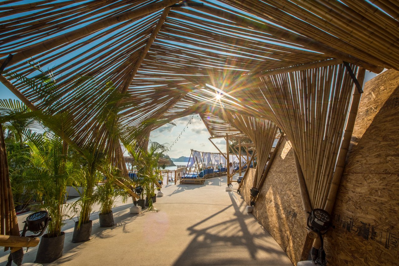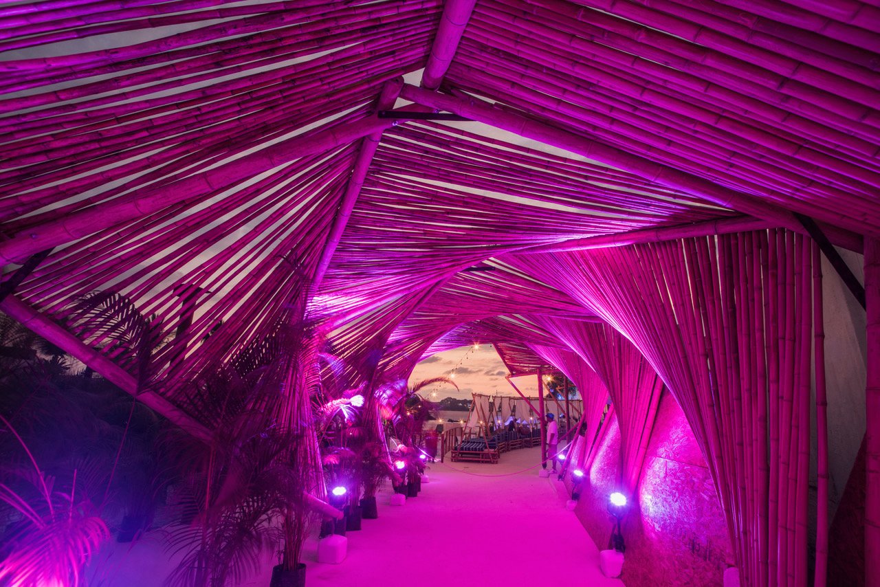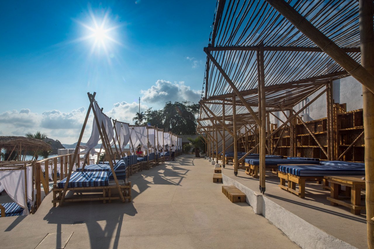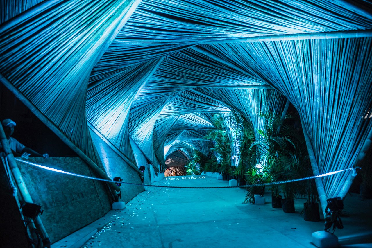 Estructuras ligeras para sombras de un club de playa en Acapulco, la palapa del Dj, la palapa de la alberca, la cubierta de la barra, el túnel de acceso en forma de vórtice y los camastros se realizaron combinando diferentes especies de bambú; guadua, oldhamii, phyllostachys y otate.