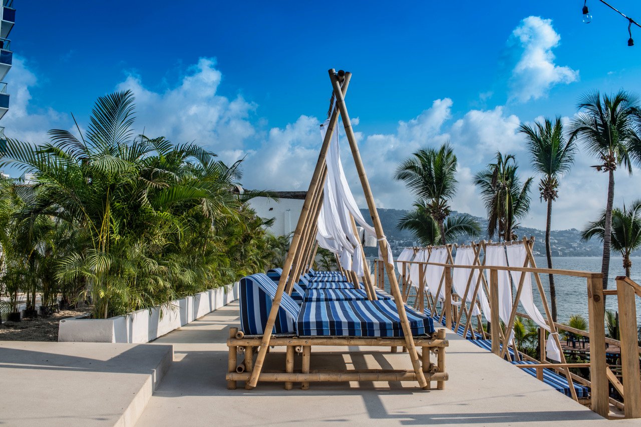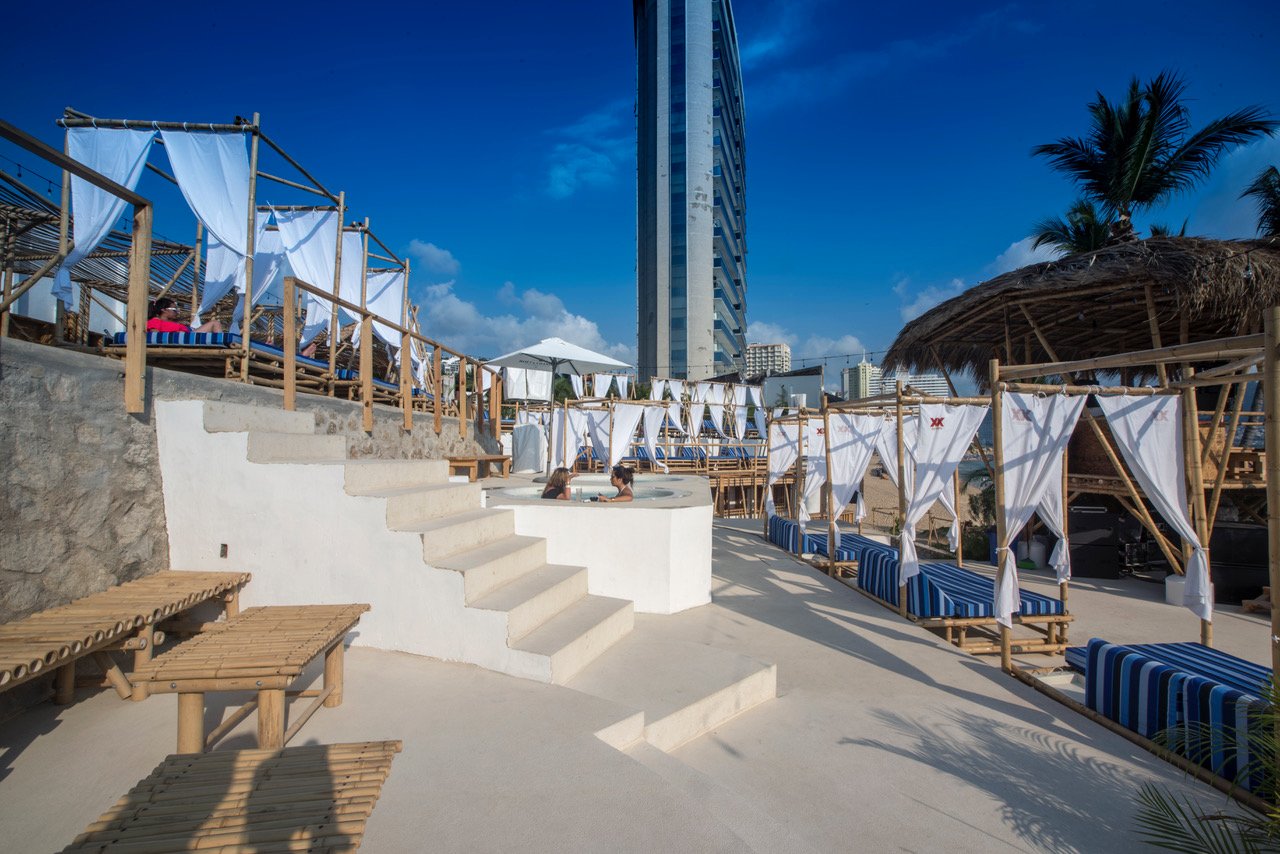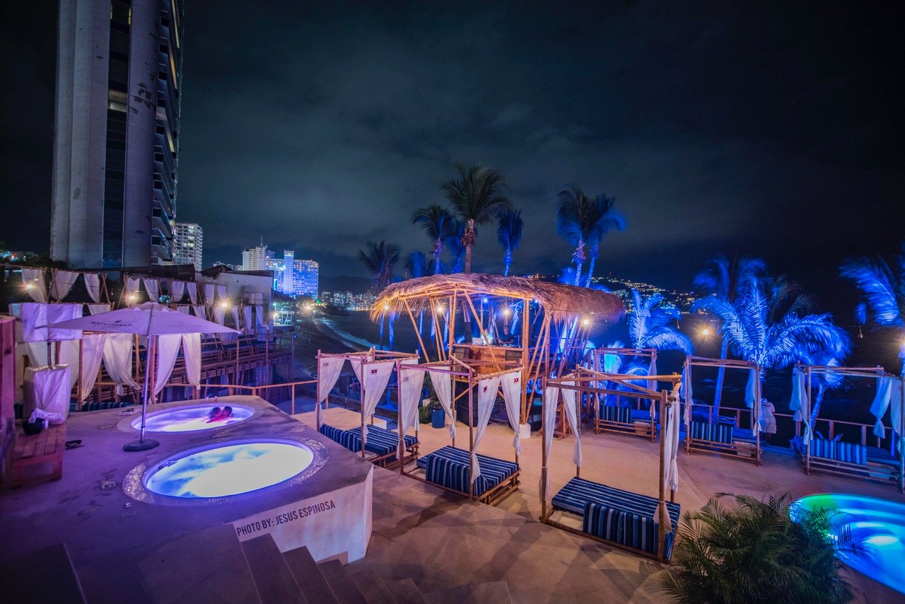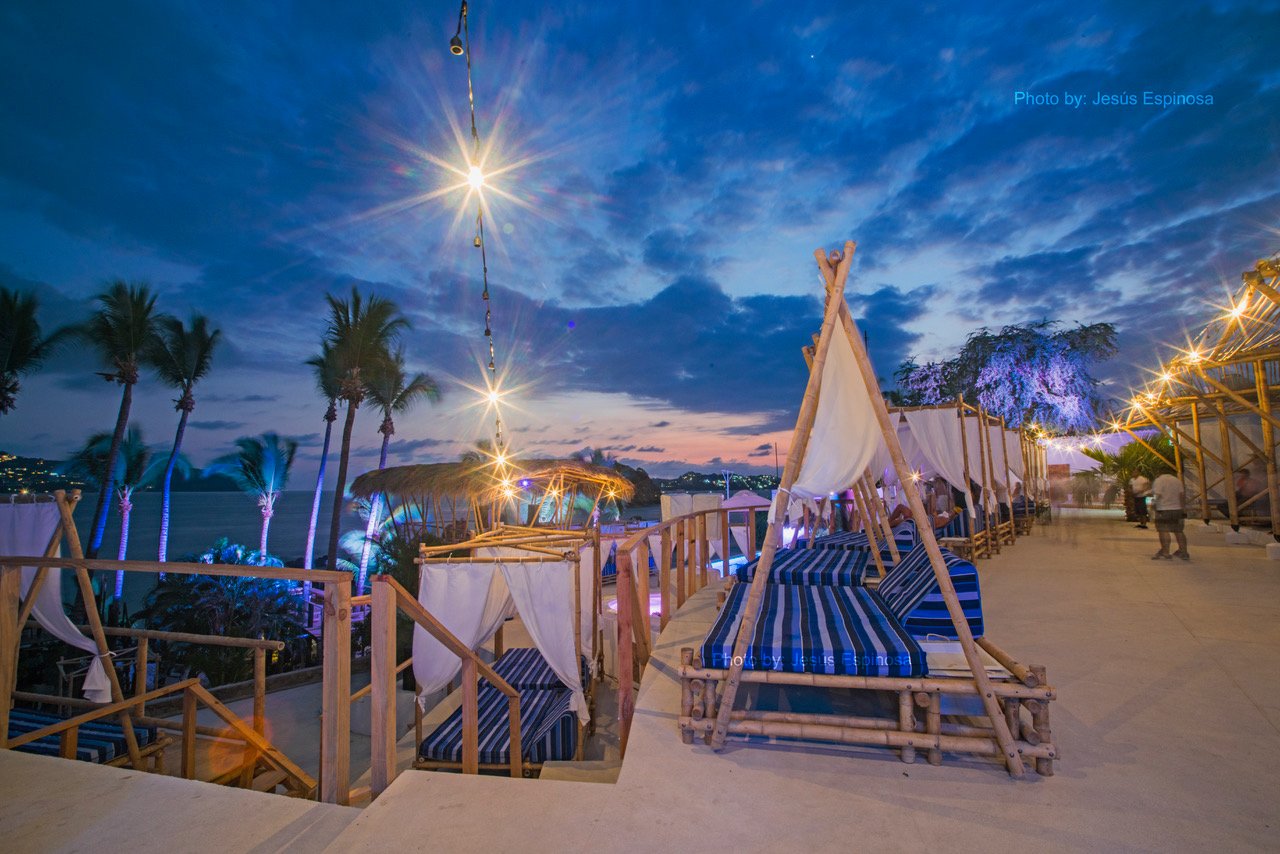Estructuras ligeras para sombras de un club de playa en Acapulco, la palapa del Dj, la palapa de la alberca, la cubierta de la barra, el túnel de acceso en forma de vórtice y los camastros se realizaron combinando diferentes especies de bambú; guadua, oldhamii, phyllostachys y otate.