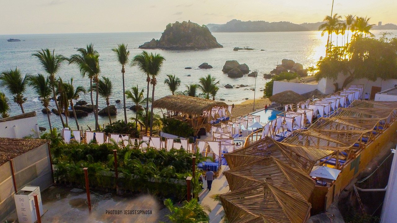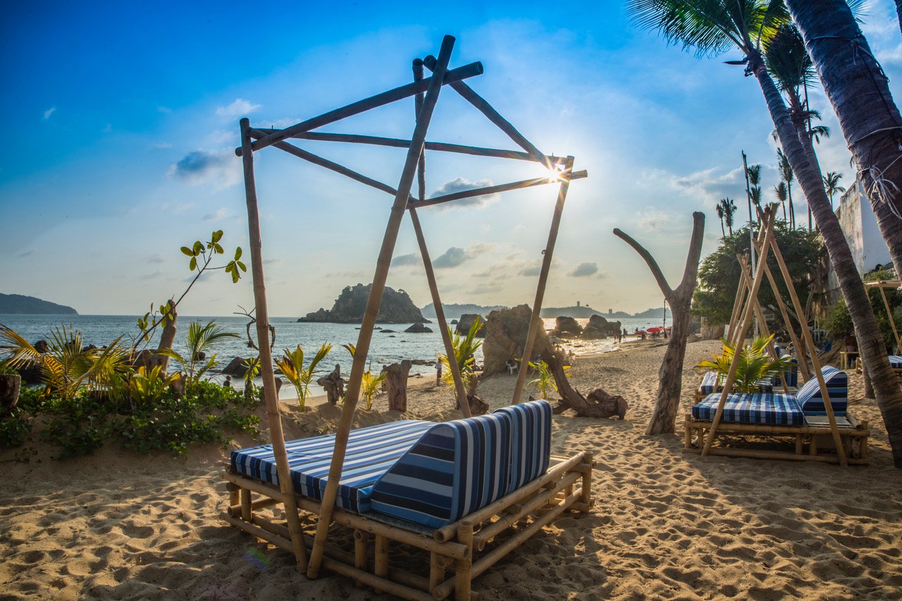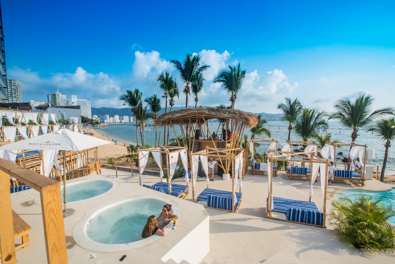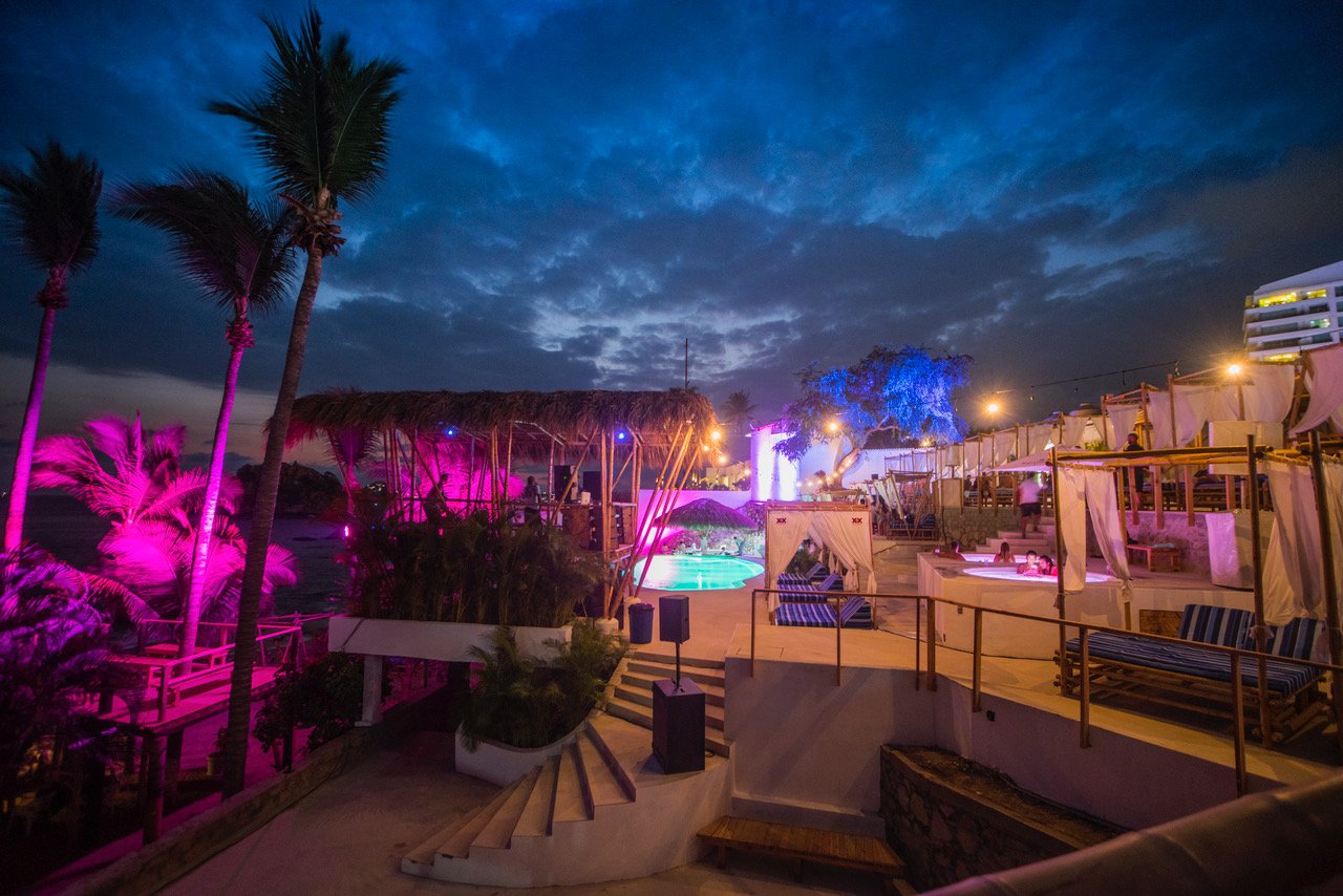 Estructuras ligeras para sombras de un club de playa en Acapulco, la palapa del Dj, la palapa de la alberca, la cubierta de la barra, el túnel de acceso en forma de vórtice y los camastros se realizaron combinando diferentes especies de bambú; guadua, oldhamii, phyllostachys y otate.