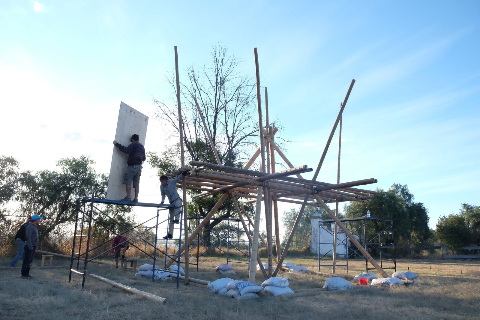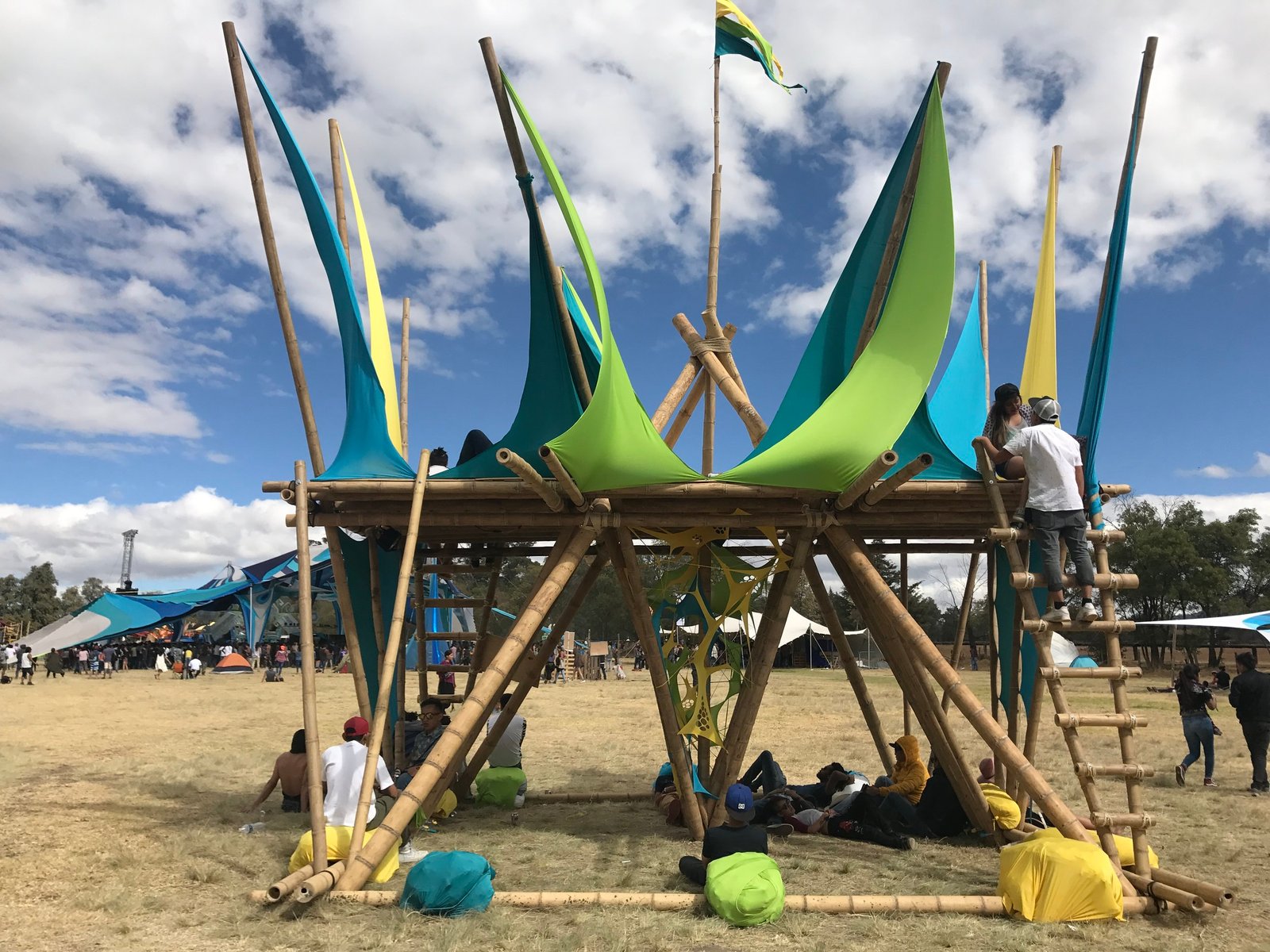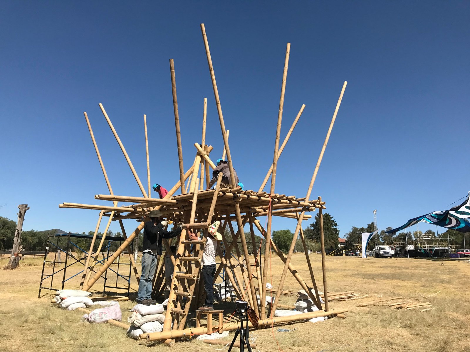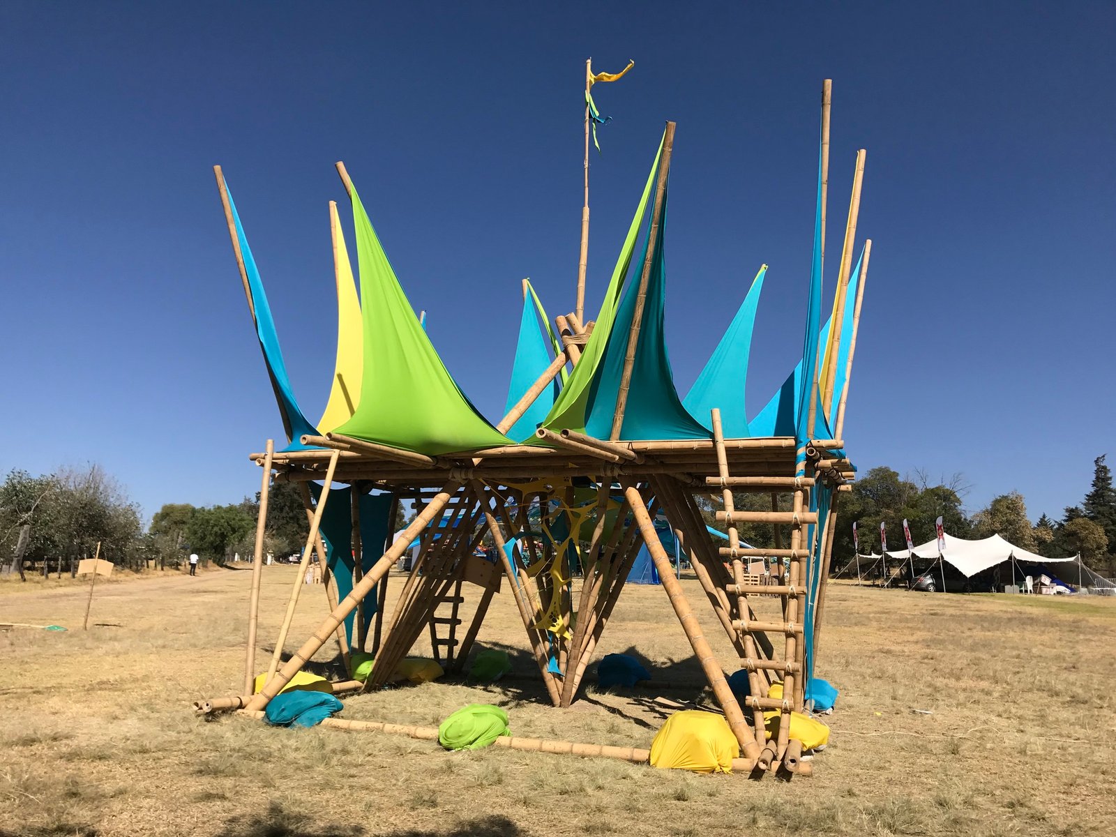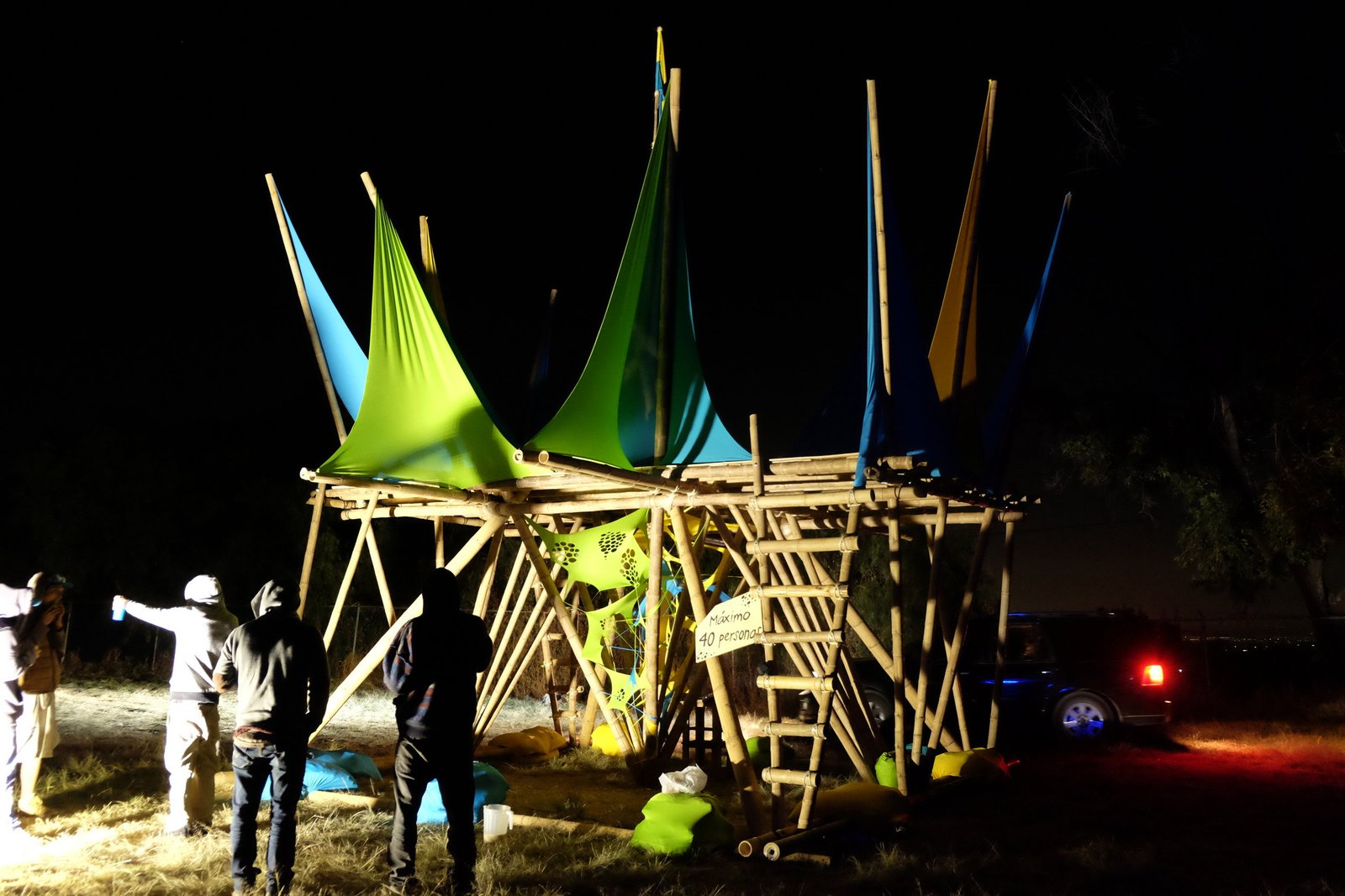 Torre de bambú con conexiones de acero y amarres especiales, decoración con telas de lycra.
