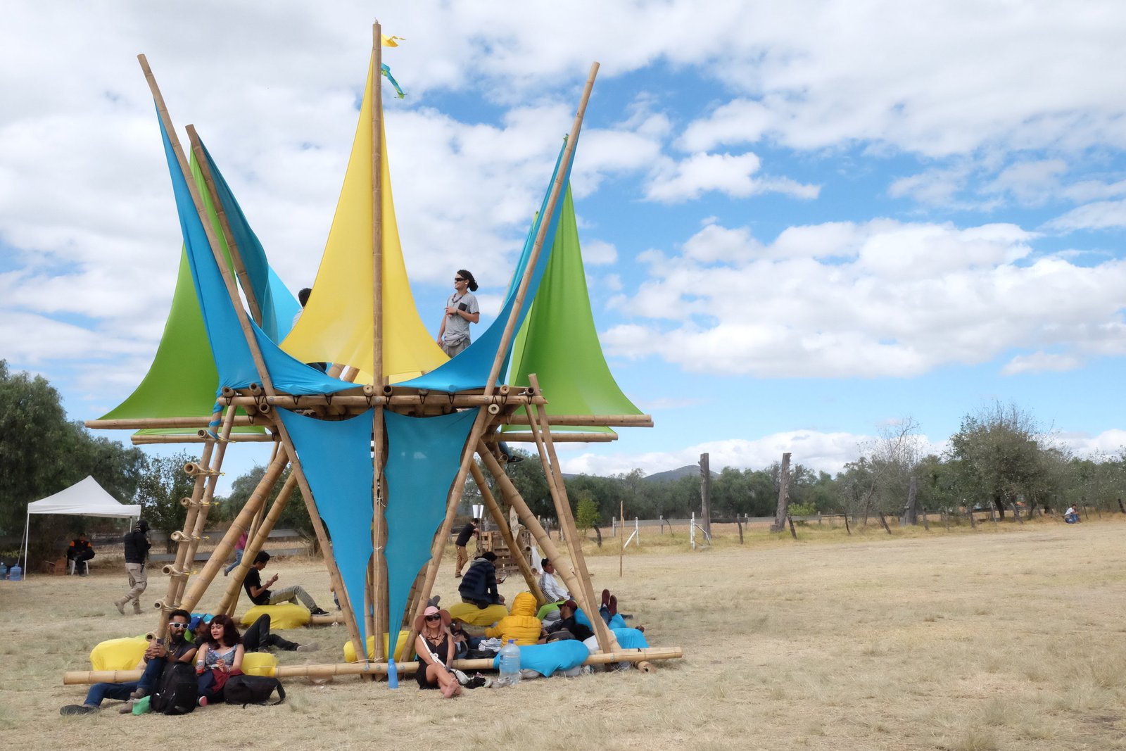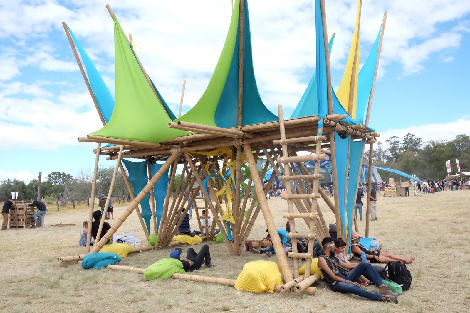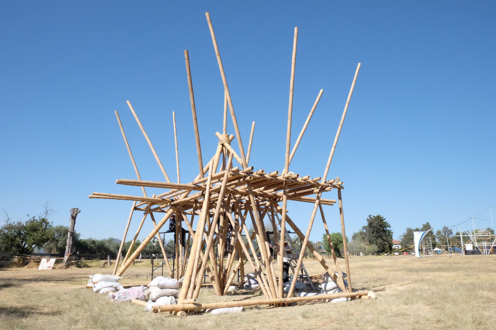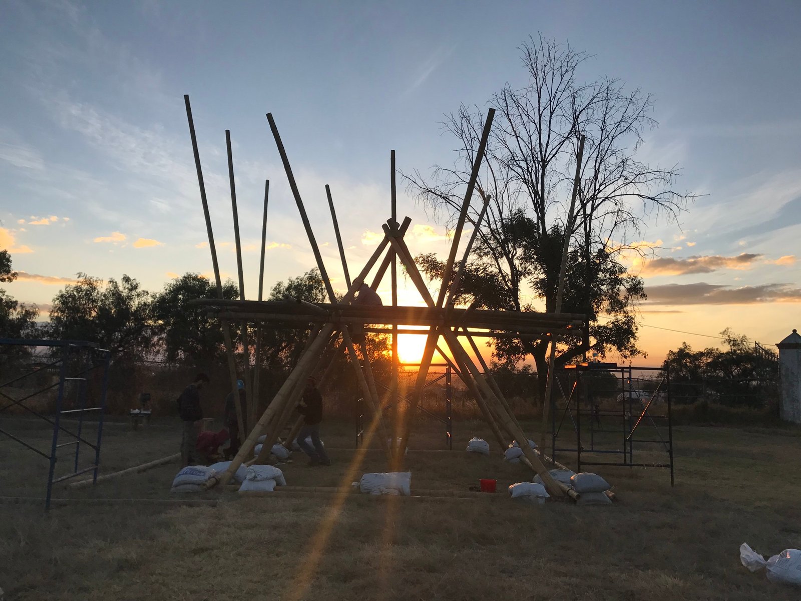 Torre de bambú con conexiones de acero y amarres especiales, decoración con telas de lycra.