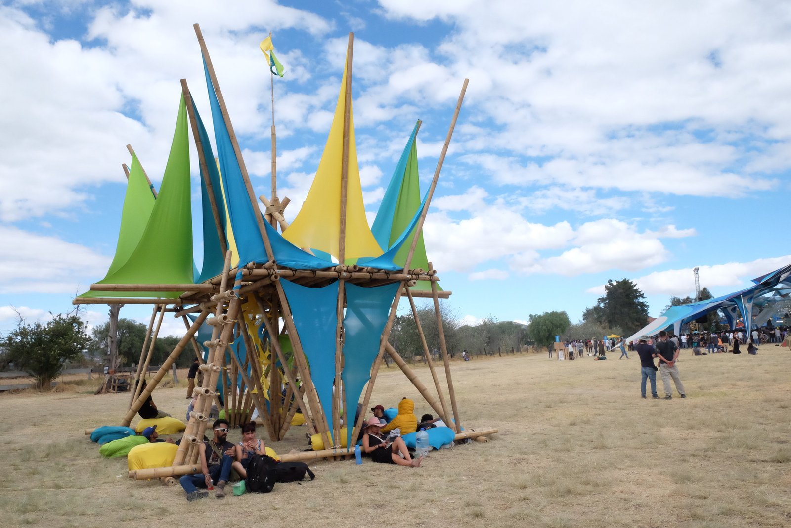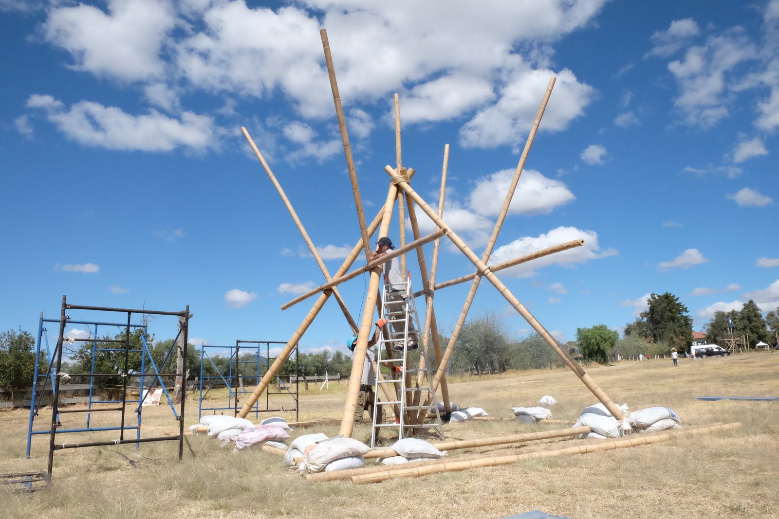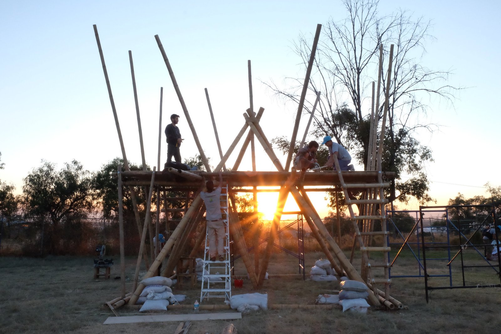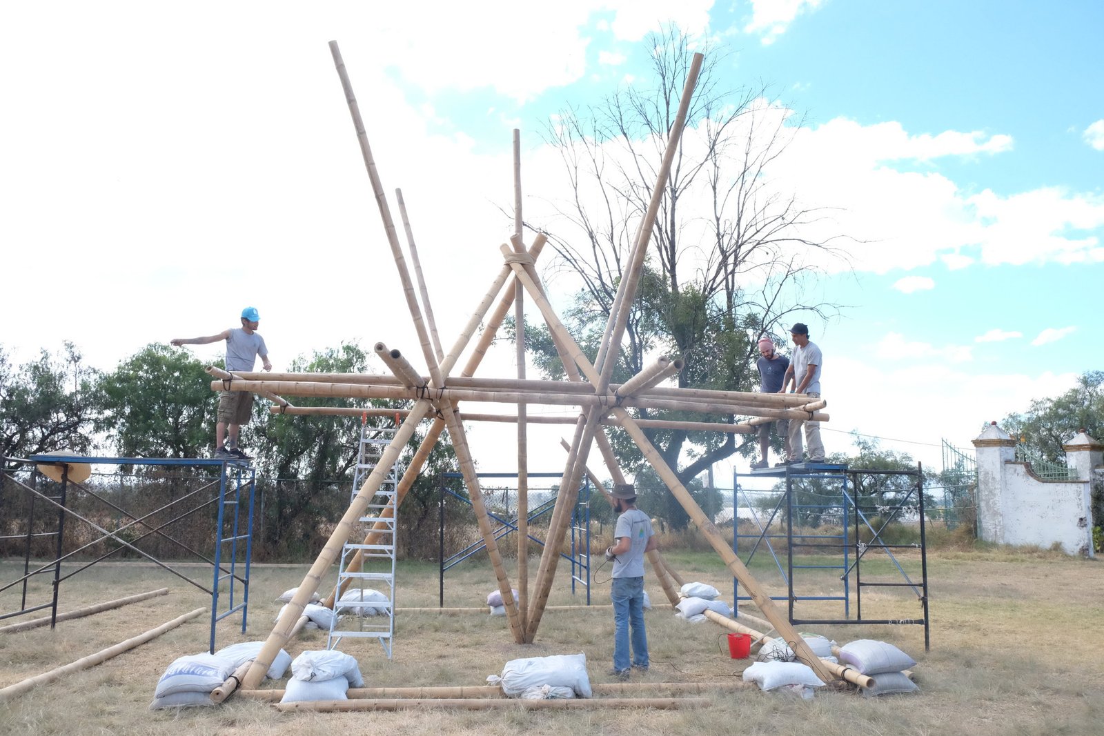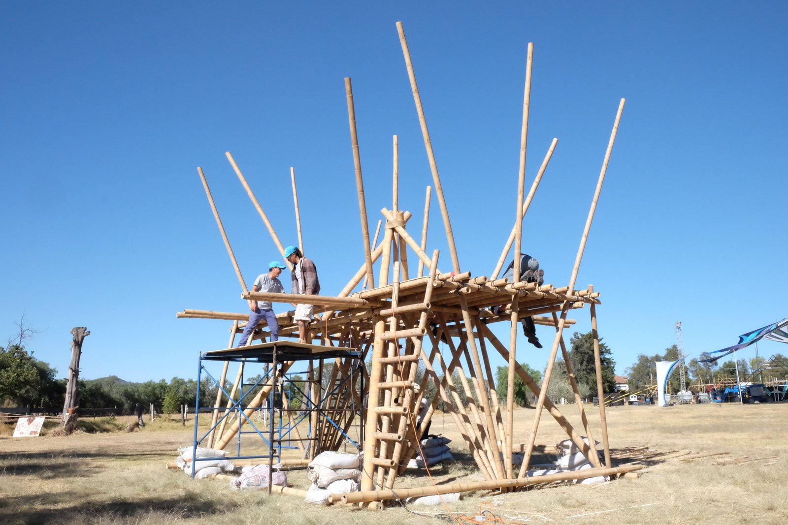Torre de bambú con conexiones de acero y amarres especiales, decoración con telas de lycra.
