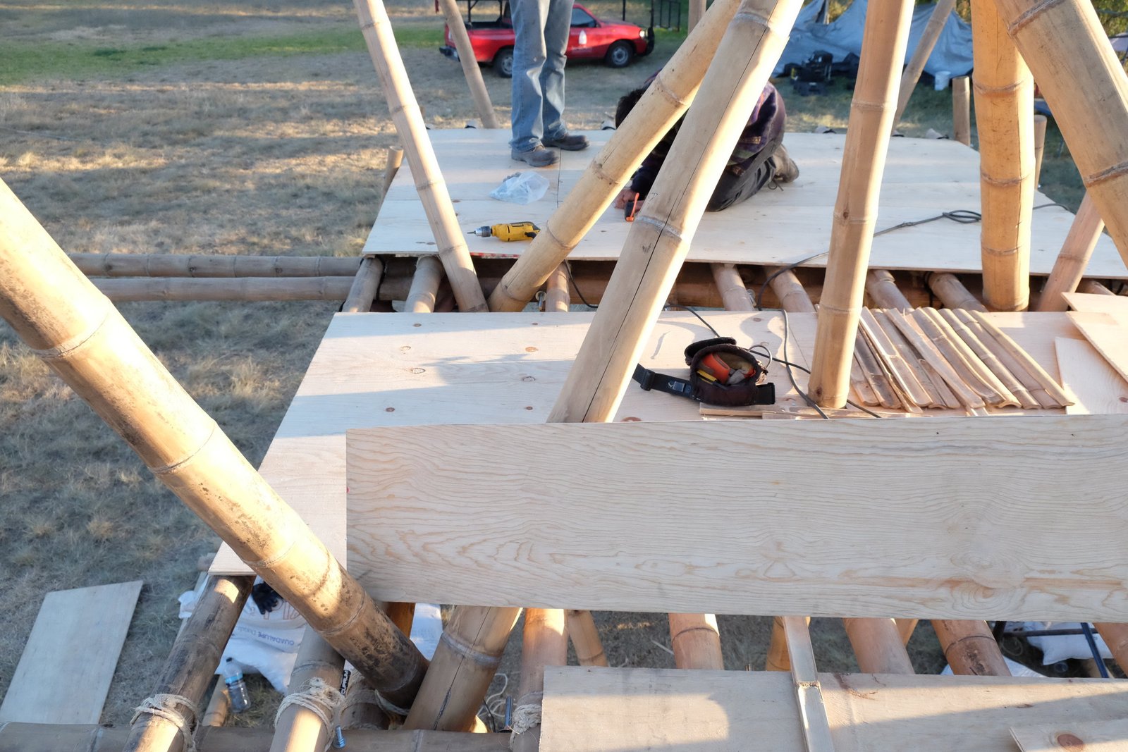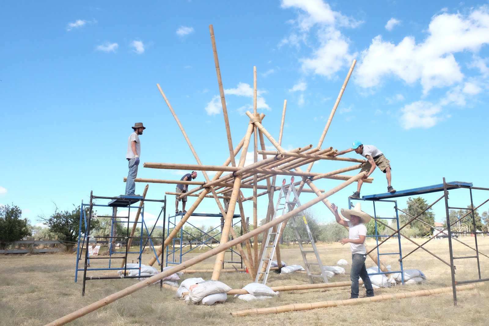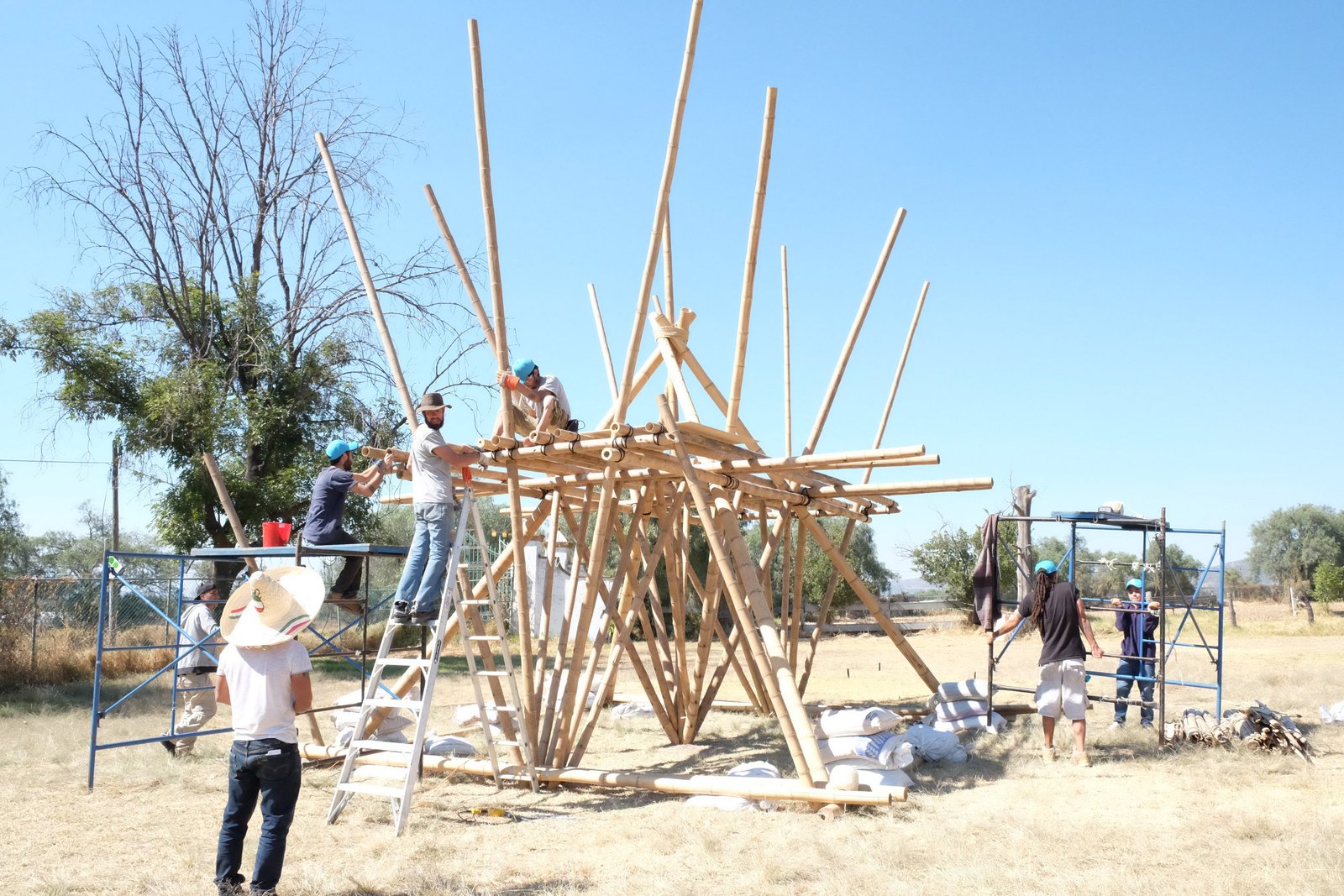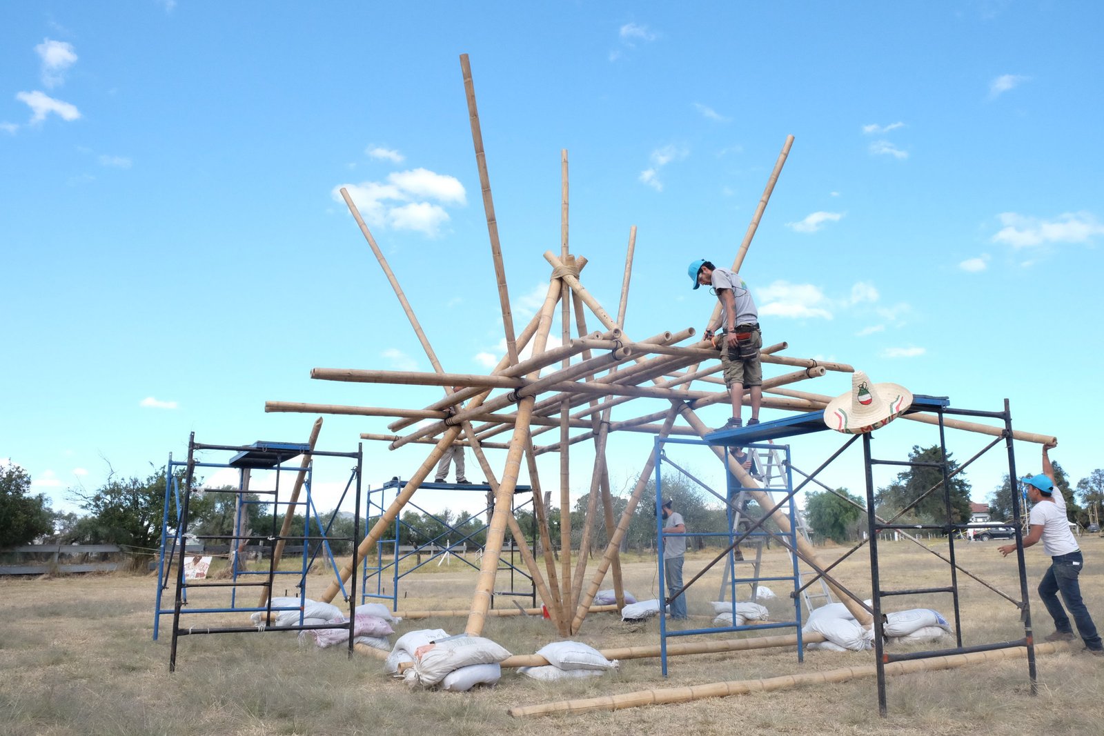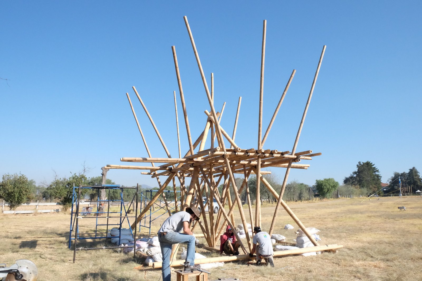 Torre de bambú con conexiones de acero y amarres especiales, decoración con telas de lycra.